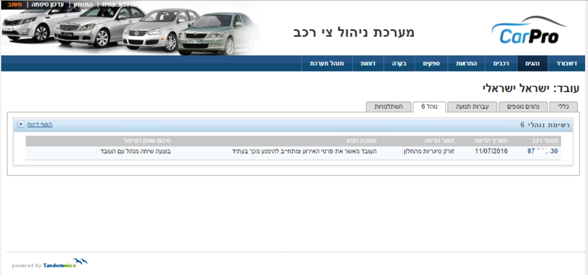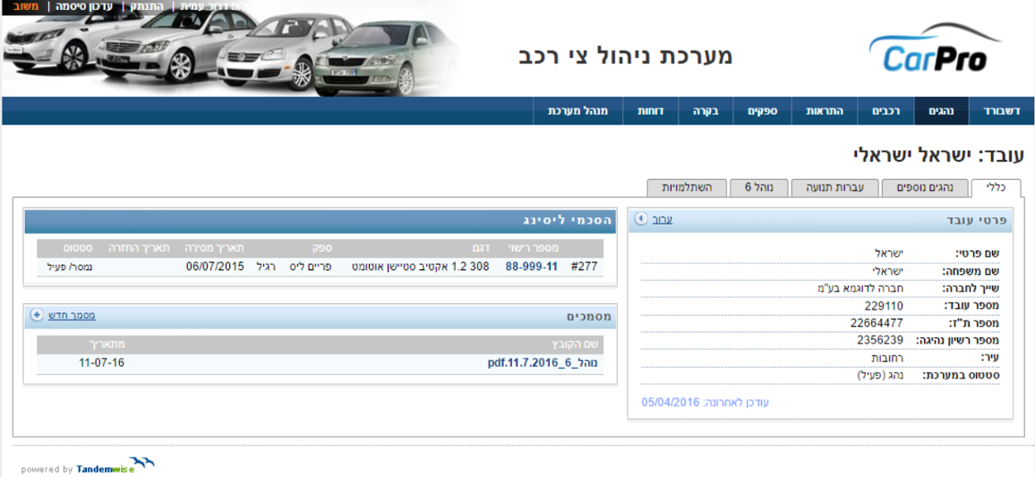 כל רשומת רכב מציגה את פרטי הדגם, ספק הרכב ואת התאריכים בהם היה משוייך הרכב לעובד. הקלקה על מספר הרישוי מאפשרת ניווט מהיר למעבר לתיק הרכב .